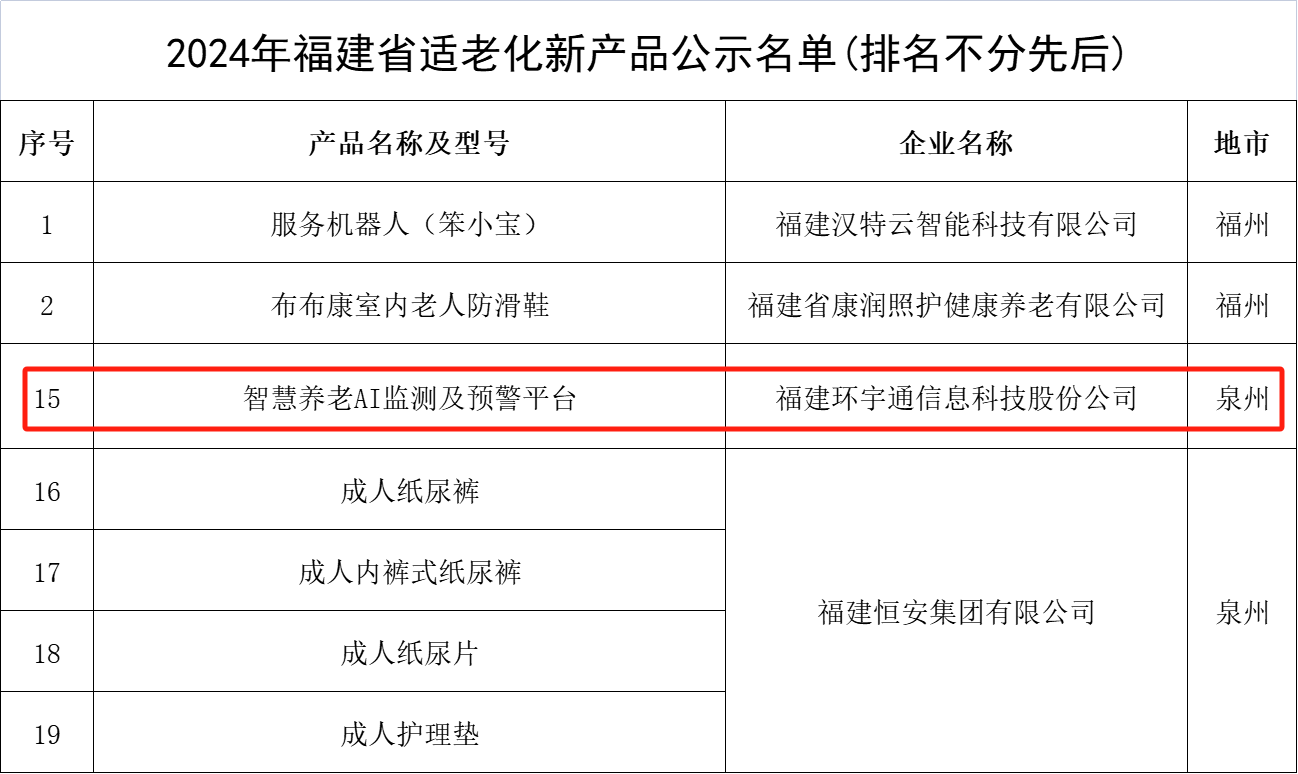 2024年11月19日,2024年福建省适老化新产品公示名单公布,全省有24款产品位列名单,泉州共有五款产品入选。其中1066vip威尼斯(中国)依托技术积累和创新能力所推出的“智慧养老AI监测及预警平台”入选该名单。这一荣誉不仅是对公司在“AI+医疗康养”领域的长期努力和贡献的肯定,更是对未来持续创新与高质量开展的激励。